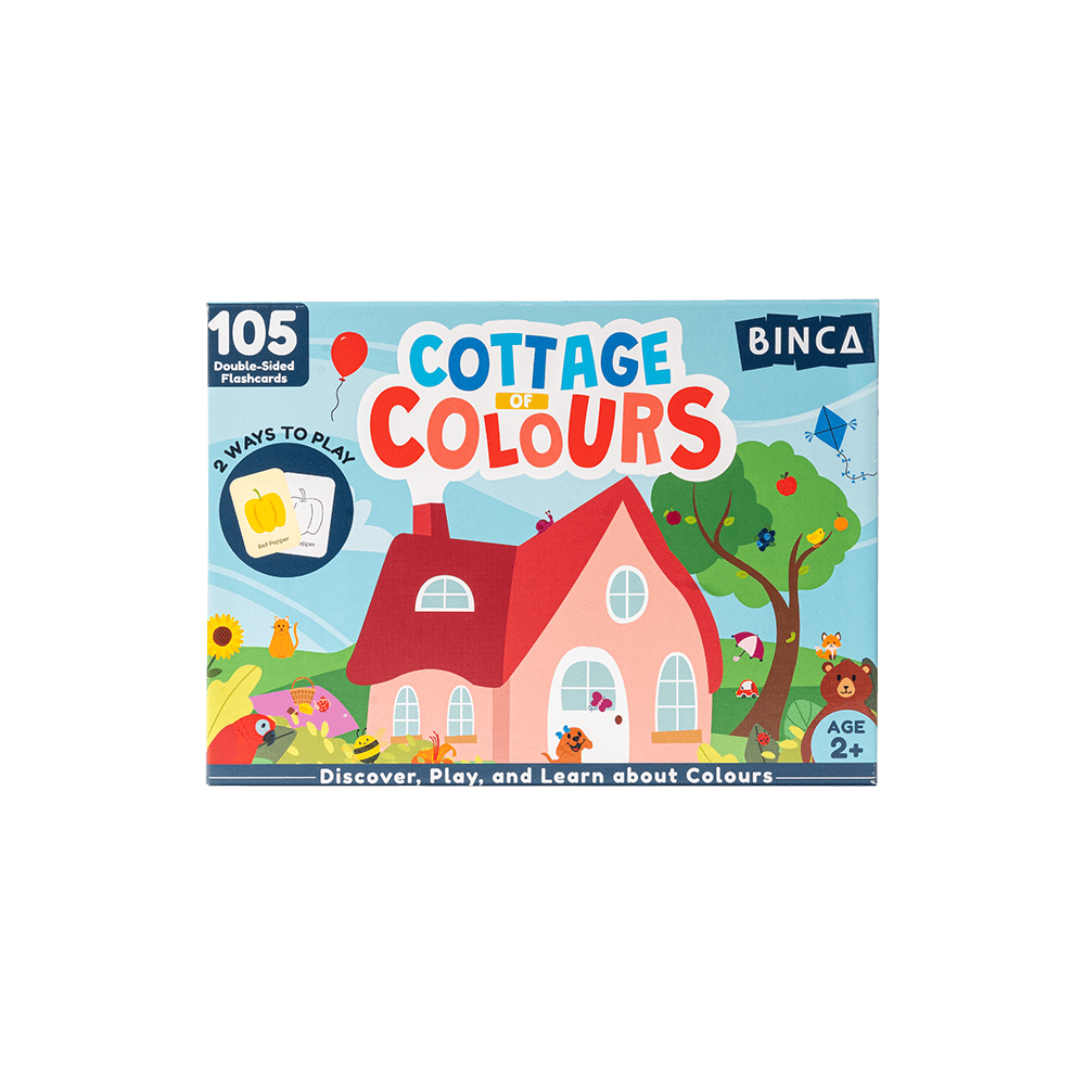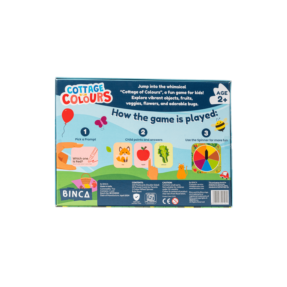 Step into the whimsical world of Cottage of Colours, a fun and engaging flash card game designed for kids! Your child will explore vibrant objects, fruits, veggies, flowers, and adorable bugs, all while learning about colours. With the help of Flashcards and a Colour Wheel Spinner, this game makes color recognition a joyful experience, enhancing object recognition and improving language & vocabulary.The included prompt cards offer versatile ways to use the flashcards, keeping learning fun and engaging. Cottage of Colours is not just a game; it’s a colourful journey your child will treasure for years to come!