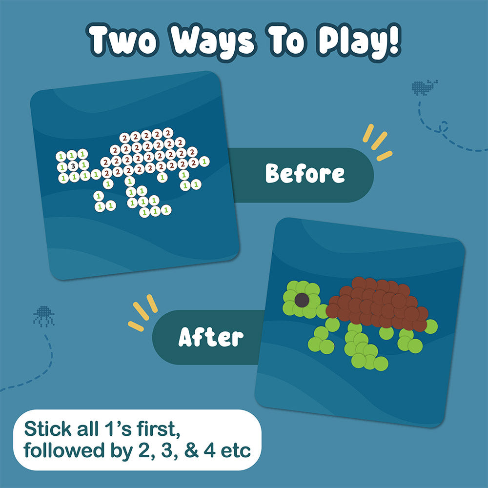 2 WAYS TO PLAY: Enjoy 2 creative ways to play - Match stickers by colour and number to reveal 4 hidden underwater animals. Then flip the canvases and piece them together for a colour-me-in sea puzzle they’ll love bringing to life!