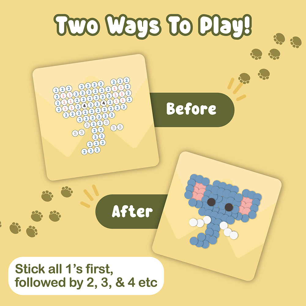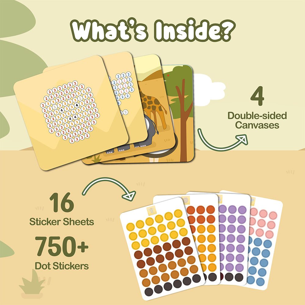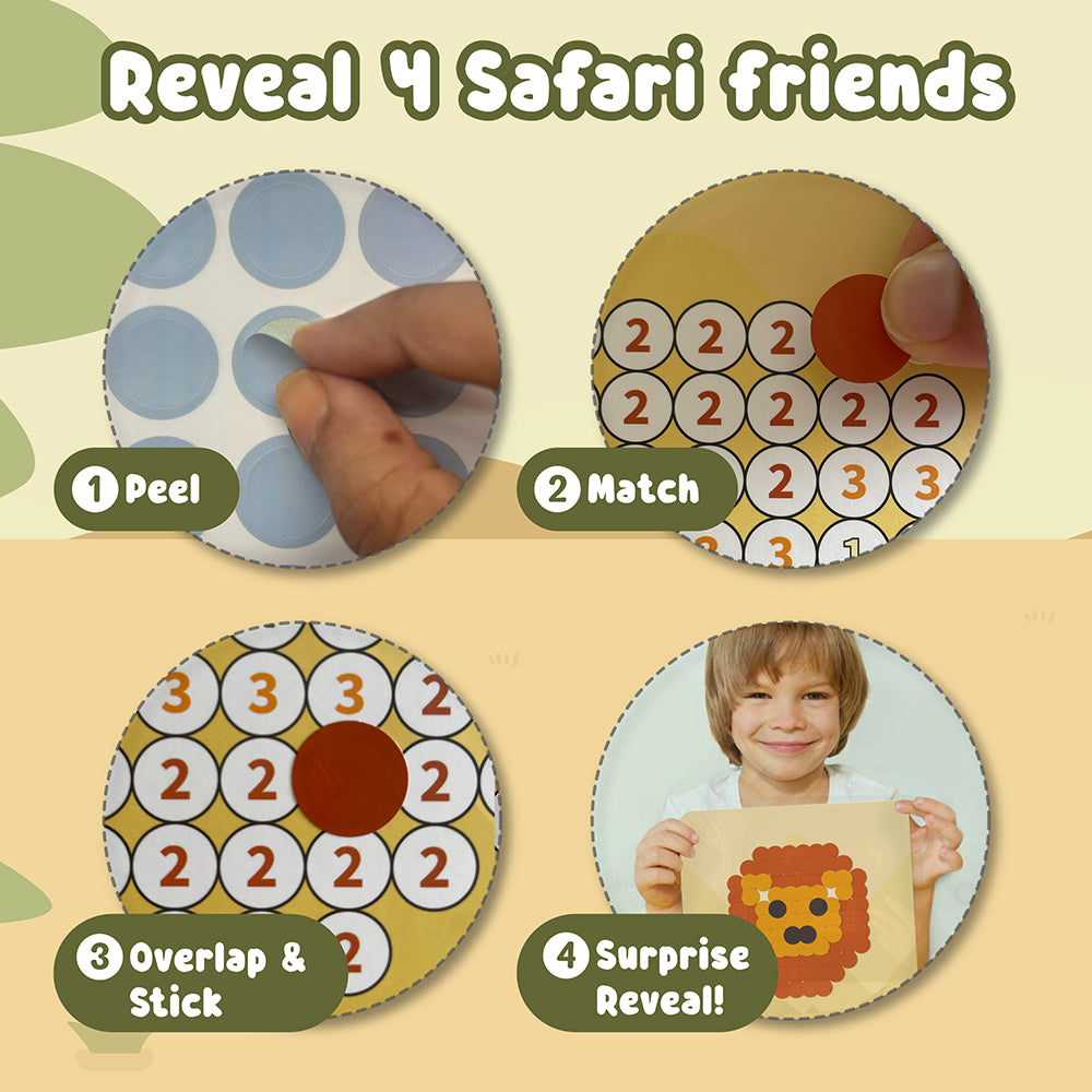 Hey there, explorers! We're going on a safari to spot 4 hidden animal friends! But how will we reveal it? By sticking colourful dots on each canvas, of course! Each dot sticker is like a piece of the puzzle. Match the colour of the dots to the coloured numbers on the canvas, and watch the picture come to life. Which animals do you think you'll spot? Let's use our imagination and find out together!