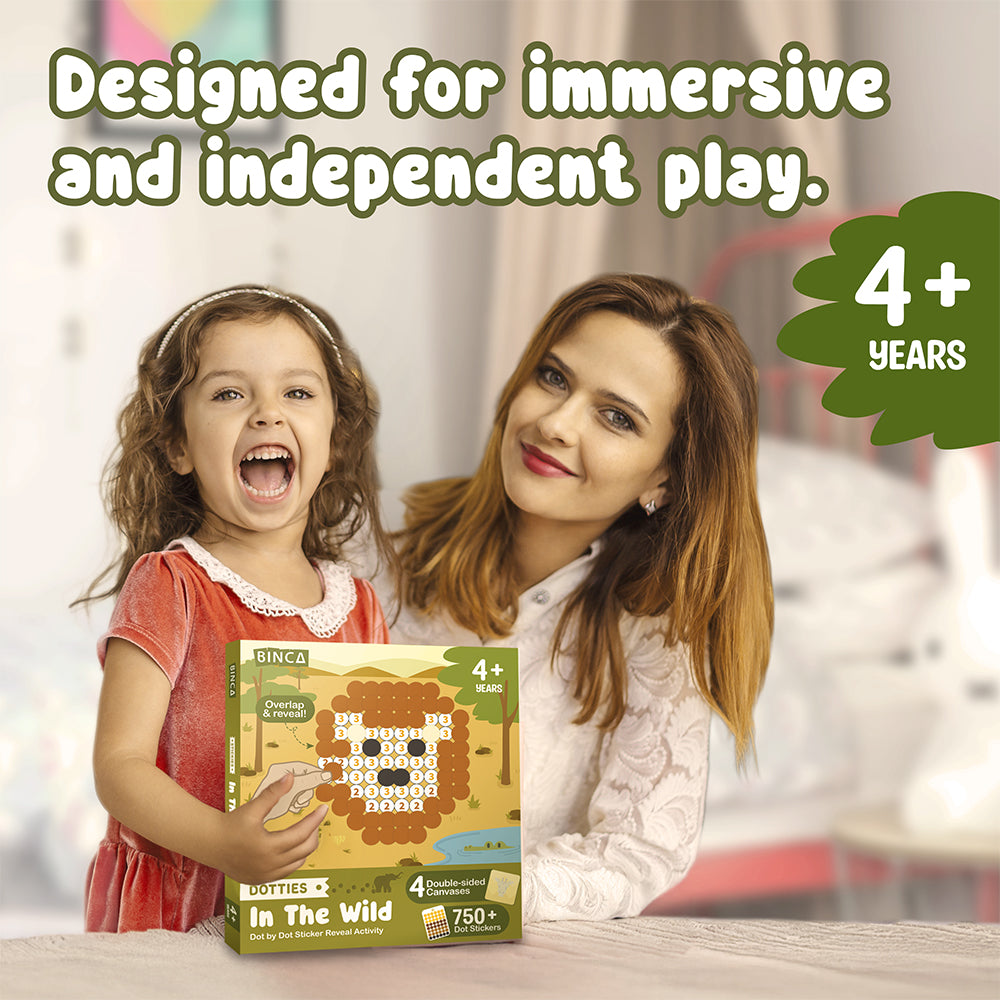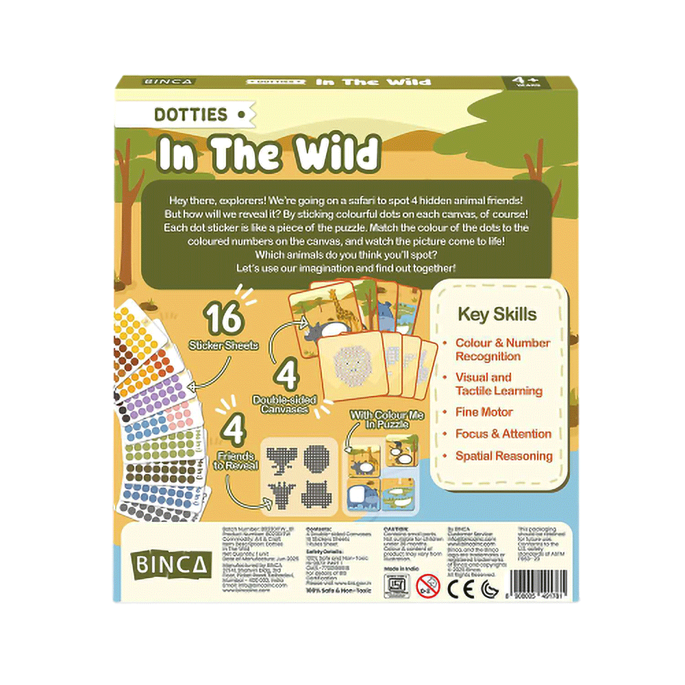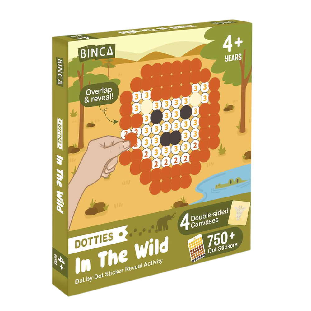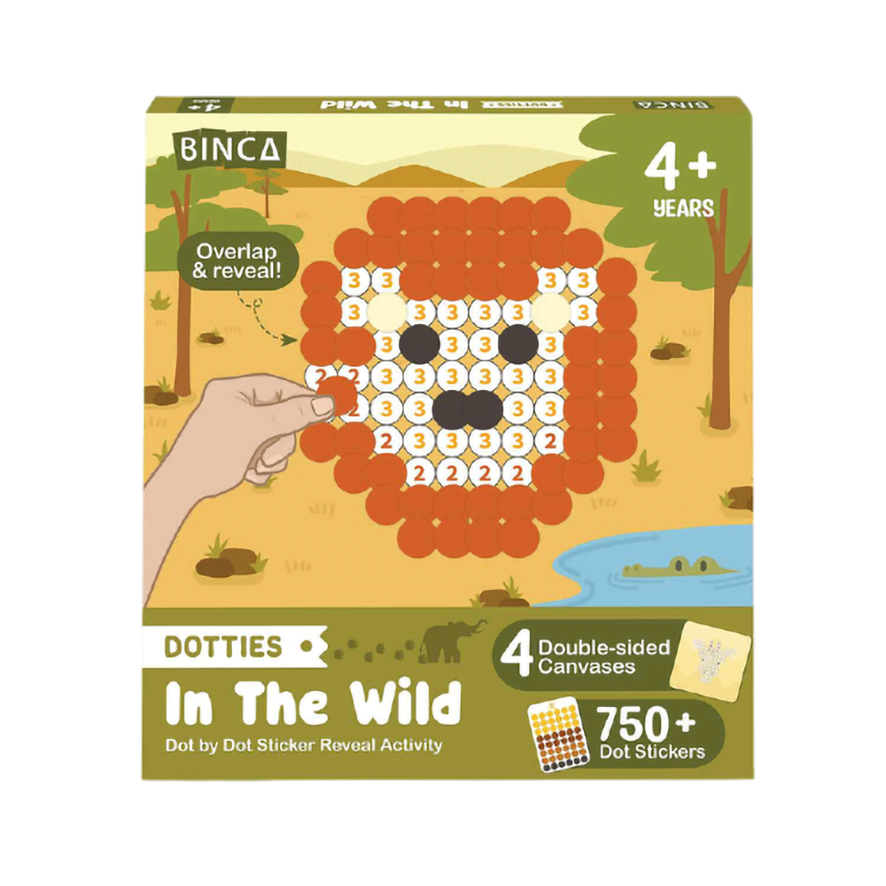 Hey there, explorers! We're going on a safari to spot 4 hidden animal friends! But how will we reveal it? By sticking colourful dots on each canvas, of course! Each dot sticker is like a piece of the puzzle. Match the colour of the dots to the coloured numbers on the canvas, and watch the picture come to life. Which animals do you think you'll spot? Let's use our imagination and find out together!