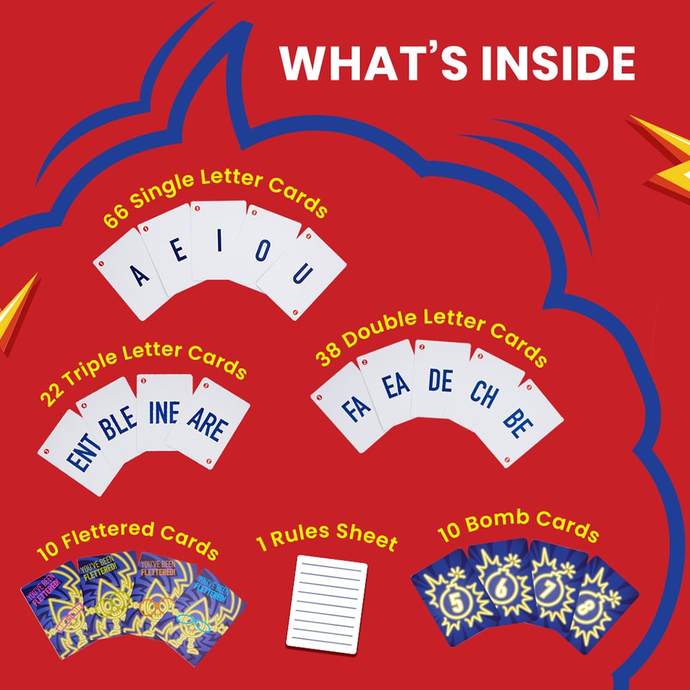 Fletter Fuse is a thrilling word-building card game where speed meets strategy. Race to form words, grab points, and outsmart your opponents in this fast-paced challenge. With increasing levels of challenge and engaging play, it’s ideal for kids, teens, and adults who enjoy testing their word skills.
